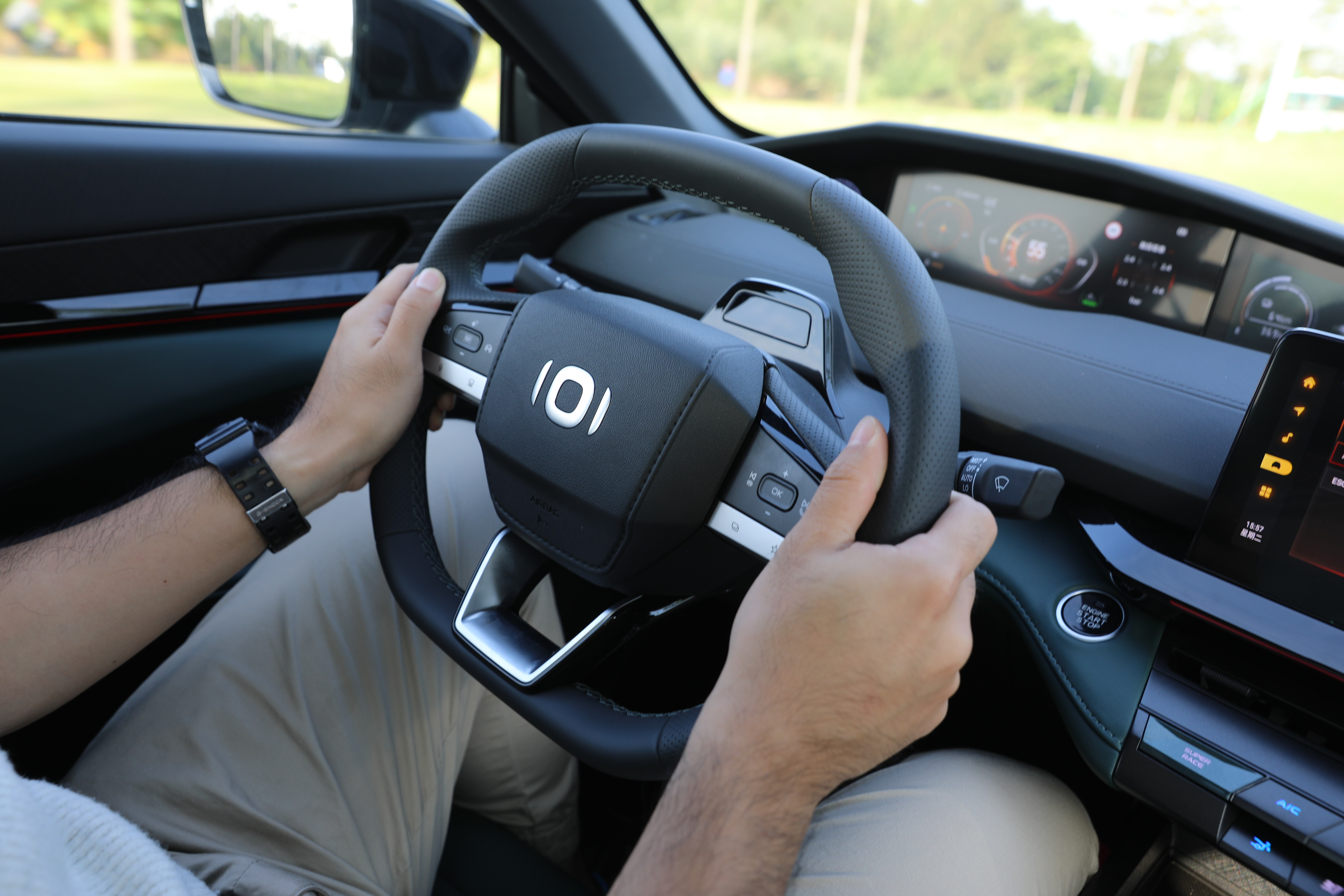 智能驅(qū)動(dòng)模式能夠幫助車(chē)輛在不同電量狀態(tài)下,以最優(yōu)的驅(qū)動(dòng)結(jié)構(gòu)對(duì)動(dòng)力進(jìn)行分配,而當(dāng)筆者啟動(dòng)SUPER RACE模式,首先映入眼簾的是儀表盤(pán)、中控屏切換到更激進(jìn)的界面UI,其次,車(chē)輛的動(dòng)力進(jìn)入到嚴(yán)陣以待的狀態(tài),油門(mén)響應(yīng)更為積極,配合模擬聲浪,整車(chē)的運(yùn)動(dòng)氣質(zhì)完全展現(xiàn)出來(lái)。